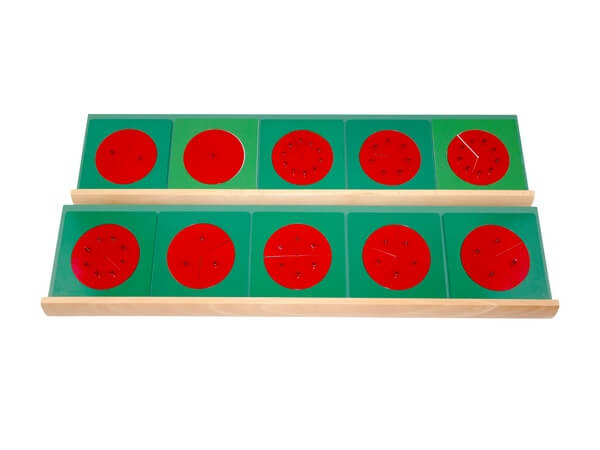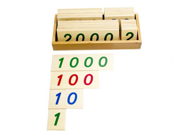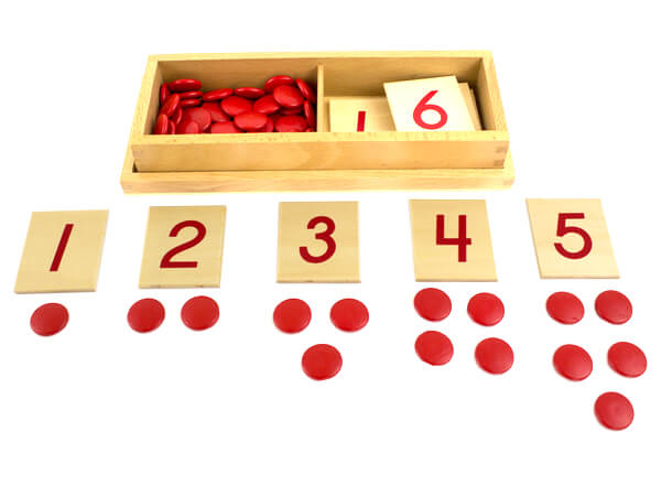 Estas herramientas permiten a los niños asociar números escritos en tarjetas (o piezas de madera) con cantidades específicas de fichas, reforzando su comprensión de los símbolos numéricos. Esta herramienta es útil para introducir los números del 1 al 10. Por ejemplo, debajo de la tarjeta con el número 5, el niño debe colocar 5 fichas.